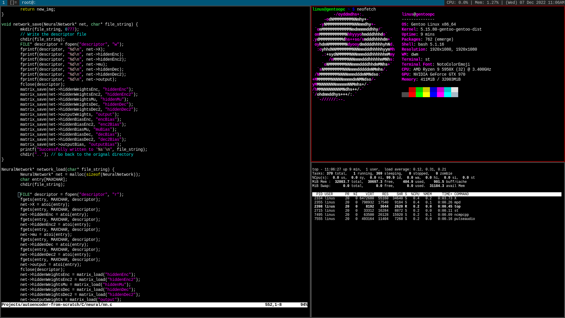 - Gentoo is a Linux distribution that allows for complete control over the software that will be running on the system. Mostly all software installed on the system is compiled from source including the Linux kernel. Because of this, users can choose to exclude certain features they wish to use in a piece of software, and everything is compiled to run optimally on your specific hardware. Consequently, it is desirable to keep the size of packages installed as small as possible to reduce the compilation time, hence why I use the very simple tiling window manager dwm. This system is almost as resource efficient as possible for a Desktop setup and idles at < 1% CPU and RAM.